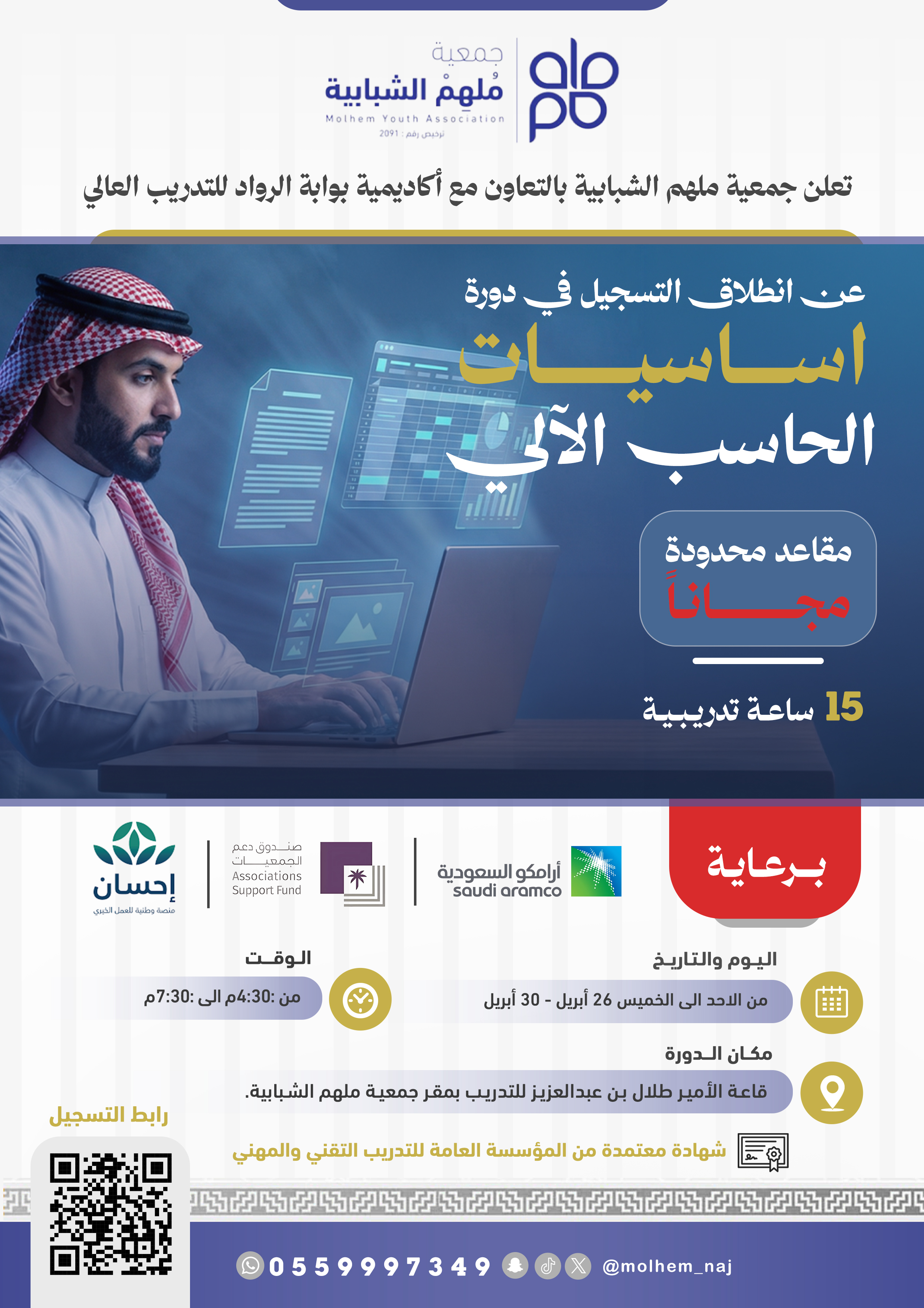 جمعية ملهم الشبابية تفتح باب التسجيل في دورة أساسيات الحاسب الآلي