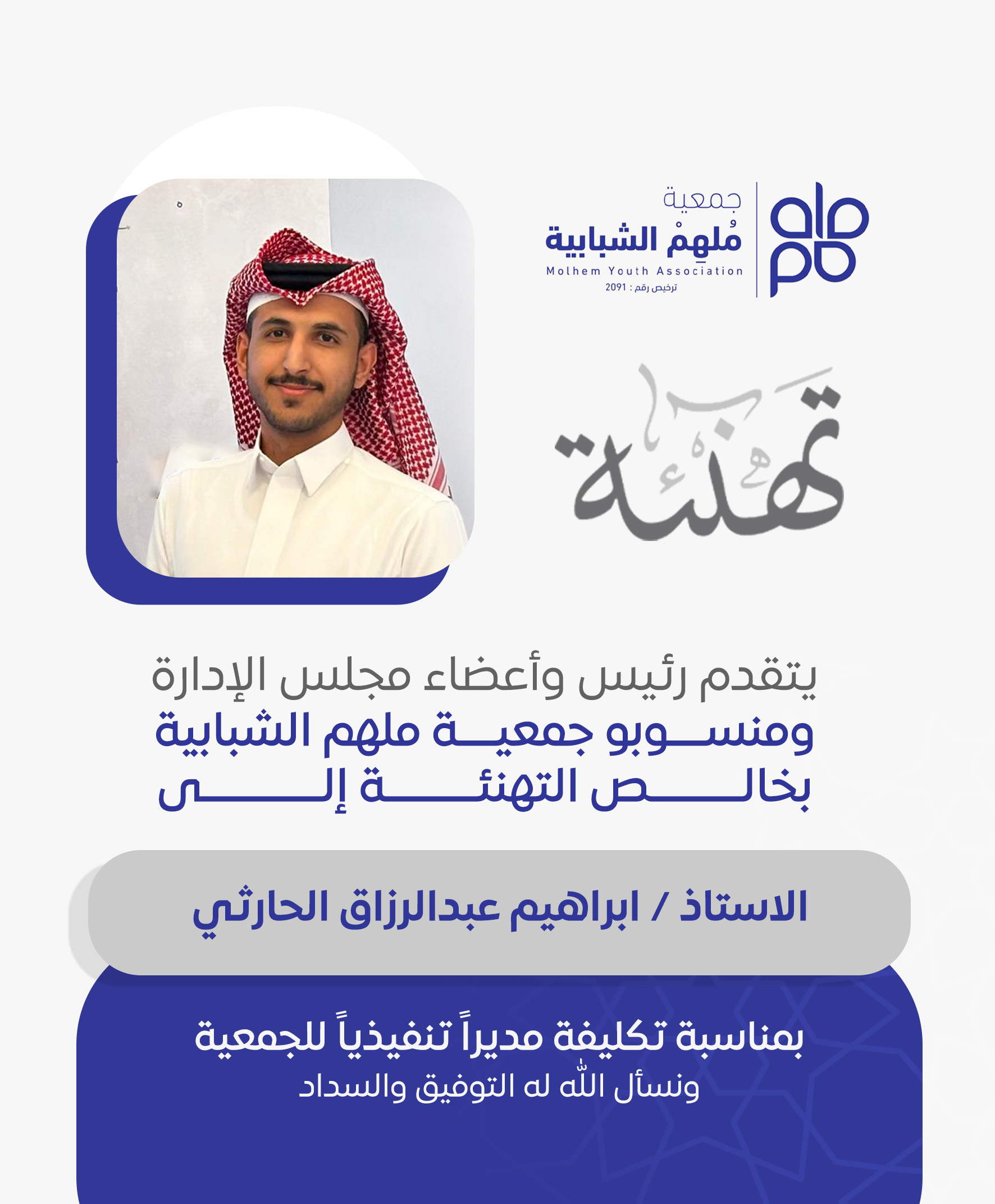 جمعية ملهم الشبابية تهنئ الاستاذ علي ال جعران بمناسبة حصوله على الماجستير